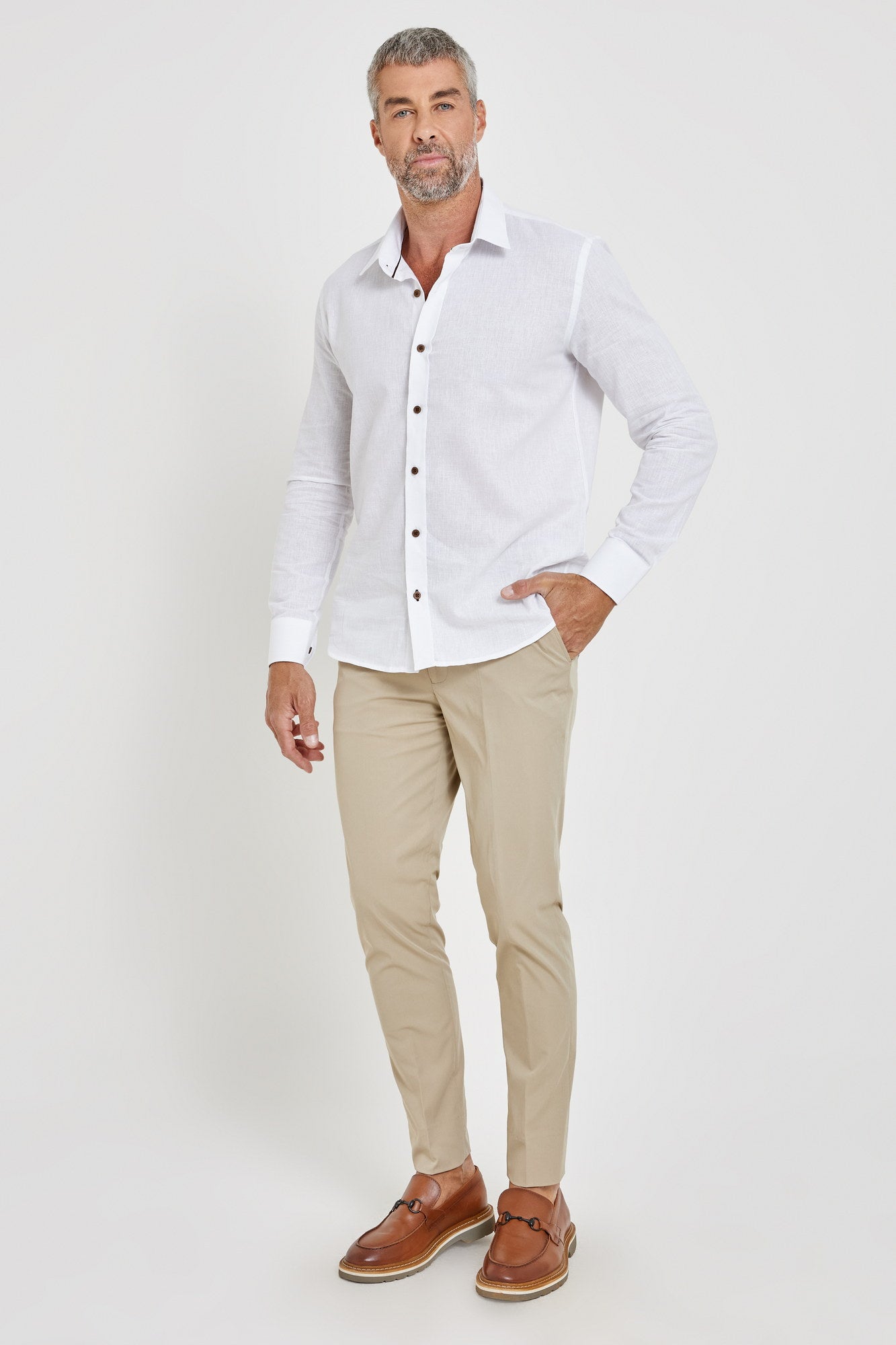 Seu tecido leve e resistente proporciona liberdade de movimento sem perder o toque refinado característico da alfaiataria contemporânea.